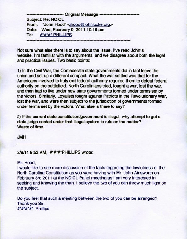 If you've been keeping up with the recent dialog between John Ainsworth, the NCICL, and John Hood (of the John Locke Foundation), you know that so far the arguments espoused by Mr. Ainsworth and the North-Carolina American Republic have yet to be sufficiently challenged, much less defeated. Well folks, let it be known that journalist John Hood has again responded! In his three-paragraph, 173-word email, John Hood has laid out what he believes to be the end-all rebuttal to this argument challenging the lawfulness of Reconstruction and the nationalization of citizenship. So honestly folks, "what else is there to say?"